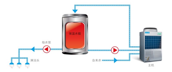 自來(lái)水經(jīng)“空氣能”熱水機(jī)一次加熱到60℃,供水及時(shí),即使冬季水箱溫度下降時(shí),系統(tǒng)自動(dòng)進(jìn)入循環(huán)加熱,提升水箱溫度,保證水箱隨時(shí)都有熱水供應(yīng)。